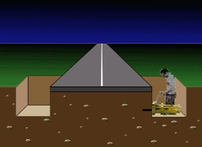 We use a directional thrust boring machine to drill under the road and install water pipes, electrical and telephone cables etc.